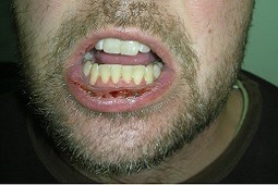 Nadżerki pokryte strupami na czerwieni wargowej wargi dolnej z towarzyszącym cuchnieniem z ust u młodego mężczyzny ze śluzówkowo-dominującą PV (korespondujący ze zdjęciem poziom surowiczych anty-DSG1 IgG 17,860 RU/ml; anty-DSG3 IgG 56,860 RU/ml; punkt odcięcia 20 RU/ml).