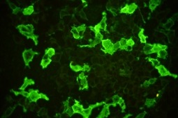 Mozaika IIF do diagnostyki autoimmunizacyjnych dermatoz pęcherzowych: autoprzeciwciała IgG przeciwko zewnątrzkomórkowej i przezbłonowej domenie DSG3 ulegające ekspresji w transferowanych komórkach HEK293 u młodego mężczyzny ze śluzówkowo-skórną pęcherzyca zwykłą.