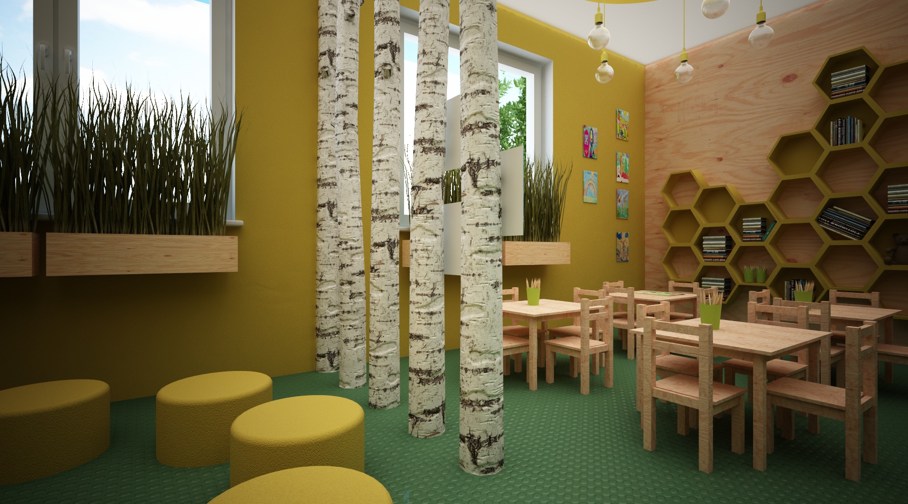 • Brzozowy las i drewniane meble – mają za zadanie wprowadzić namiastkę przyrody do sztucznego środowiska jakim jest szpital. Dzieci potrzebują kontaktu z naturą, bo ta pobudza ich kreatywność, pozwala się zrelaksować i zapomnieć o chorobie.