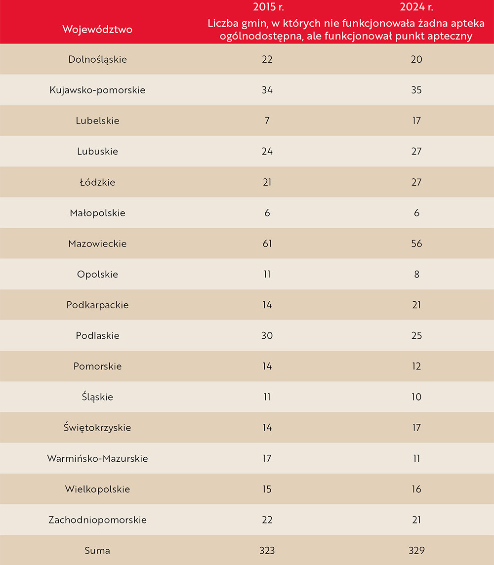 W Polsce jest niemal 2,5 tys. gmin, a w mniej więcej 300 z nich nie ma apteki ogólnodostępnej, przy czym w zaledwie co trzeciej nie działa też żaden punkt apteczny.