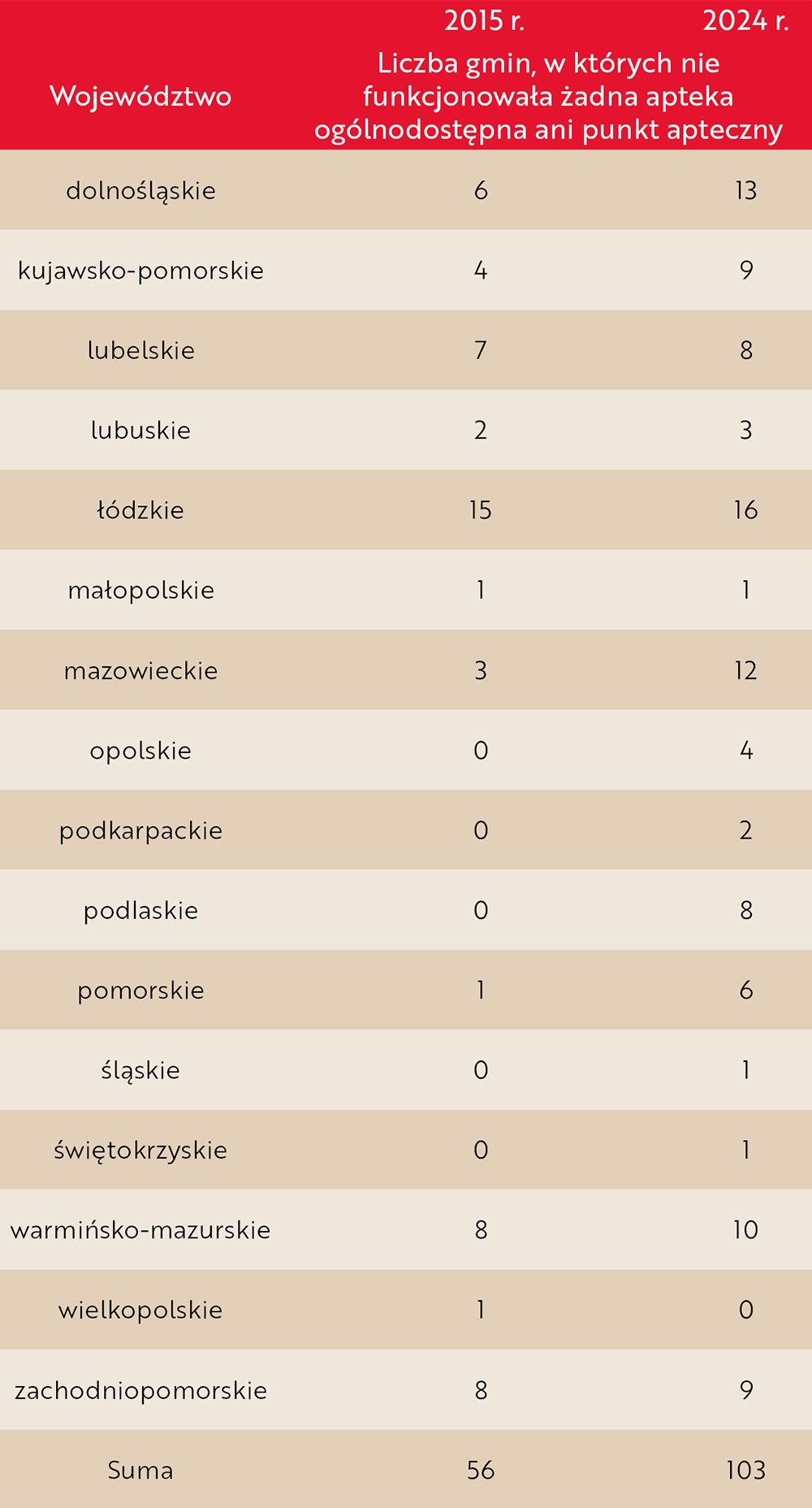 Statystyka dotyczyła liczb gmin, w których nie funkcjonowała żadna apteka ogólnodostępna i gmin, w których nie było ani apteki ogólnodostępnej, ani punktu aptecznego – z podziałem na poszczególne województwa i w porównaniu z 2015 r.