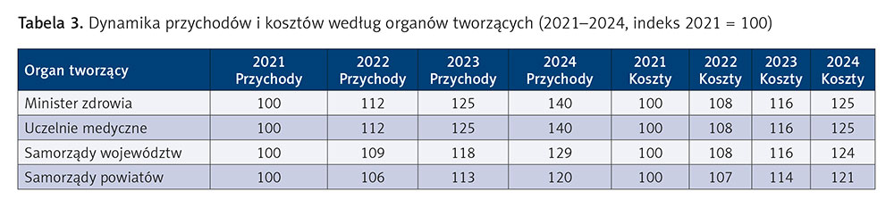 Analizujemy też dynamikę przychodów i kosztów w zależności od organów tworzących szpitale. Dane z lat 2021–2024 pokazują, że różnice wynikają zarówno z charakteru instytucji, jak i z dostępu do finansowania oraz zdolności do kontroli kosztów.