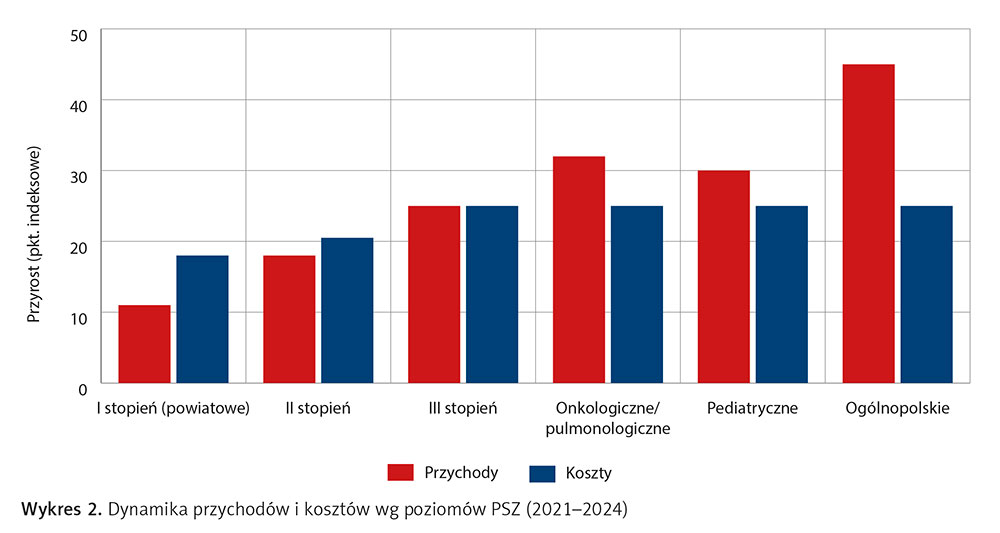 - Szpitale trzeciego stopnia utrzymują równowagę – dynamika przychodów i kosztów jest zbliżona.
