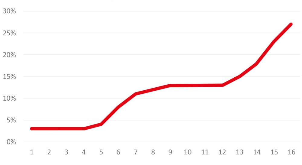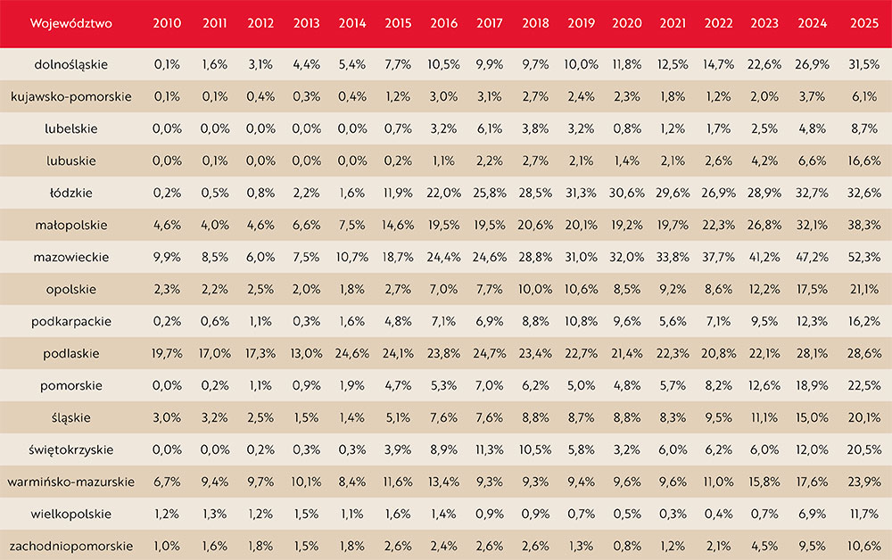 - w województwie mazowieckim wzrósł z 41 proc. do 47 proc., w łódzkim z 29 proc. do 33 proc., a w świętokrzyskim z 6 proc. do 12 proc.,