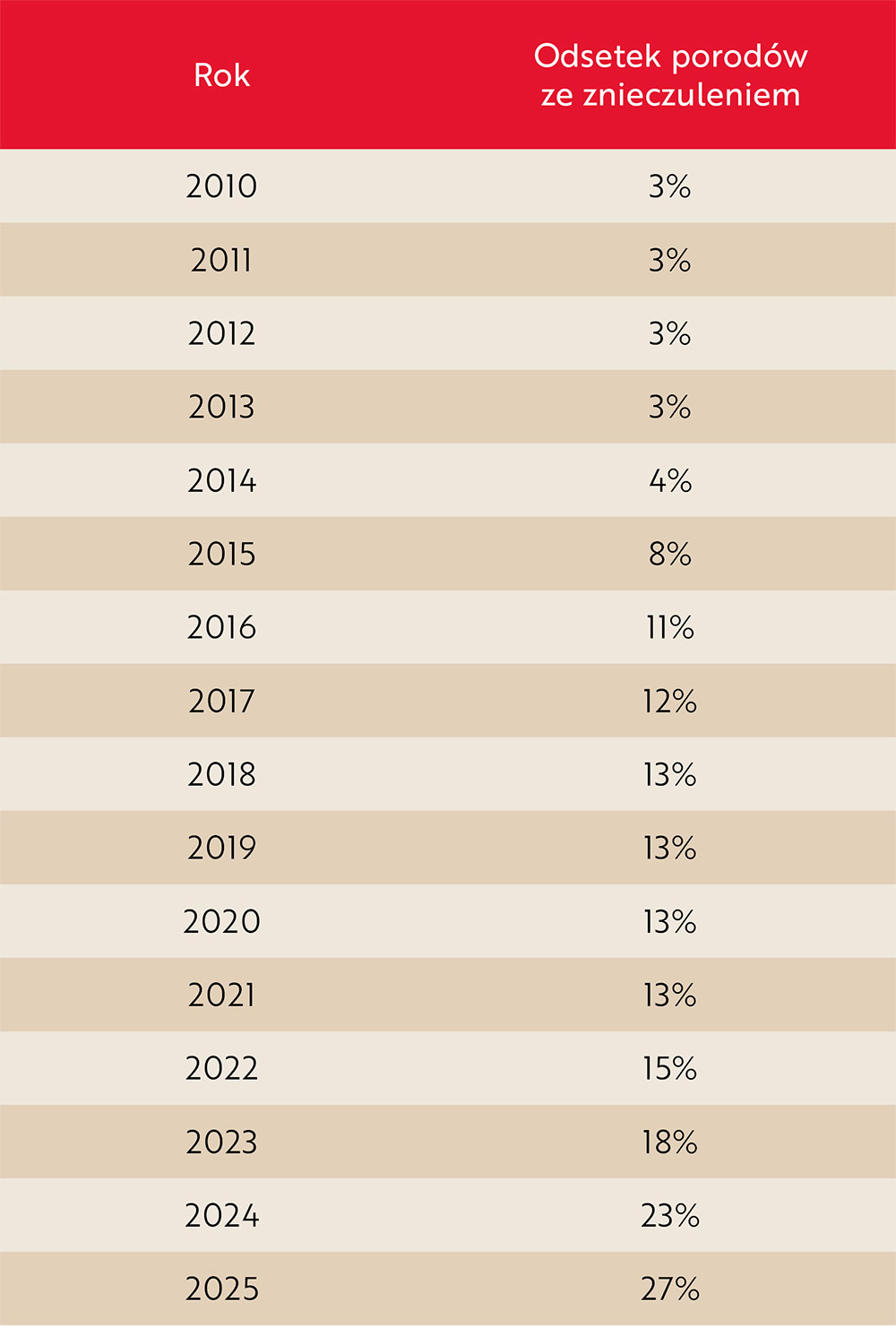 Jeszcze w 2010 r. odsetek porodów ze znieczuleniem w 2010 r. wynosił 3 proc., 2015 r. – 8 proc., 2020 r. – 13 proc., a w 2025 r. – 27 proc.