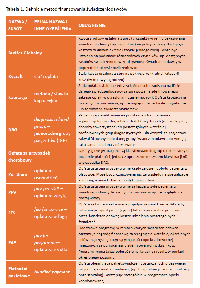 Systemy finansowania świadczeniodawców ochrony zdrowia to zestaw rozwiązań i narzędzi obejmujący metody finasowania (tab. 1) i elementów wspierających, takich jak zasady kontraktowania, systemy administracyjne do raportowania i kontroli, oraz narzędzia IT1. Ich głównym celem jest przekazanie wynagrodzenia za dostarczone usługi. Niemniej jednak, w zależności od swojej konstrukcji, systemy finansowania generują także zestaw konkretnych bodźców finansowych wpływających na zachowanie świadczeniodawców2. Sprawia to, że reformy systemów finansowania świadczeniodawców stanowią jeden z najważniejszych mechanizmów wpływania na funkcjonowanie systemów opieki zdrowotnej3.