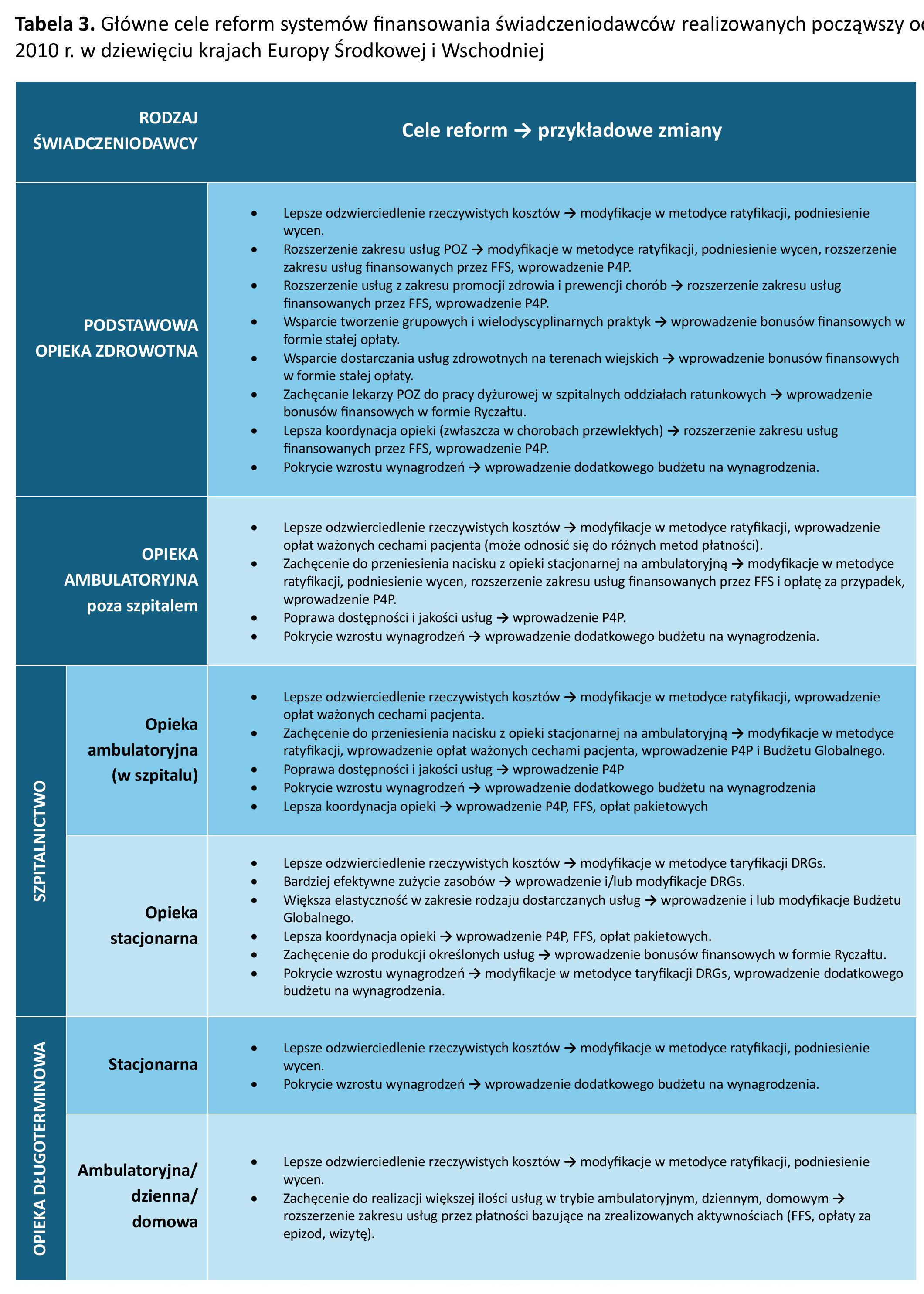 Reformy systemów finansowania świadczeniodawców usług zdrowotnych przeprowadzone od 2010 r. w analizowanych krajach koncentrowały się głównie na modyfikacji istniejących metod finansowania (na przykład zmiany w metodyce taryfikacji, uszczegółowienie i/lub zastosowanie wag dla różnych grup kosztowych) oraz wprowadzaniu dodatkowych, uzupełniających metod finansowania. Zmiany częściej dotyczyły POZ i szpitalnictwa niż specjalistycznie opieki ambulatoryjnej i opieki długoterminowej. Główne cele reform były zbliżone i obejmowały m.in. lepsze odzwierciedlenie rzeczywistych kosztów usług zdrowotnych (wspólny cel reform w odniesieniu do wszystkich rodzajów świadczeniodawców), poszerzenie zakresu usług POZ (ze szczególnym naciskiem na profilaktykę, koordynację opieki i opiekę wielodyscyplinarną), przeniesienie akcentu z opieki stacjonarnej na ambulatoryjną (zarówno w przypadku szpitali, jak i placówek opieki długoterminowej), oraz poprawę efektywności opieki szpitalnej (tab. 3).
