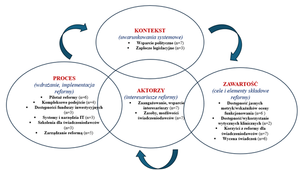 Analiza czynników, które mogły wpłynąć na sukces (lub porażkę) reform systemów finansowania świadczeniodawców usług zdrowotnych w badanych krajach wskazuje, że istotną rolę odgrywają uwarunkowania systemowe (kontekst), cele i elementy składowe reform (zawartość), jak i perspektywa interesariuszy (aktorzy). Jednak kluczowe znaczenie dla powodzenia reform ma sposób ich wdrażania (proces) (graf. 1).