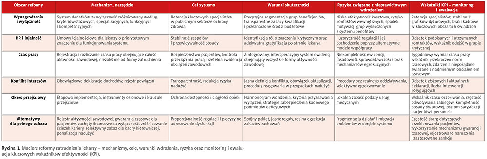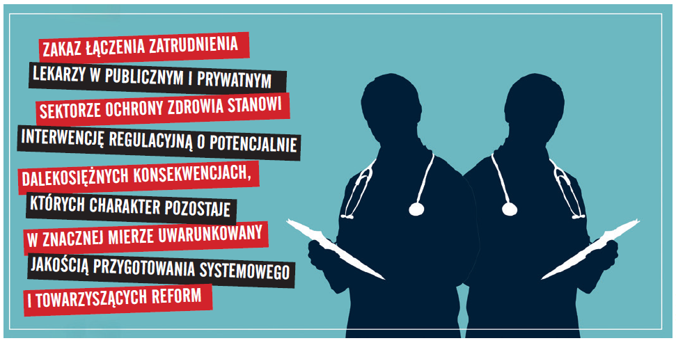 Diagnozę tę potwierdzają także zwolennicy całkowitego zakazu podwójnego zatrudnienia lekarzy, przyznając, że powodzenie reformy jest uwarunkowane wprowadzeniem kompleksowego pakietu działań, nie zaś zakazem jako izolowanym instrumentem regulacyjnym. Jeśli celem reformy jest rzeczywista poprawa dostępności i jakości publicznej opieki zdrowotnej, zakaz może stanowić jedno z narzędzi – musi mu jednak towarzyszyć gruntowna reforma warunków pracy i finansowania sektora publicznego. Zaniechanie działań wspierających doprowadzi jedynie do przesunięcia problemów – w miejsce konfliktu interesów pojawi się pogłębiony niedobór kadr lekarskich, a przedmiotem uzasadnionej frustracji pacjentów stanie się brak dostępu do specjalistów, nie zaś – jak dotychczas – ich podwójna rola zawodowa.