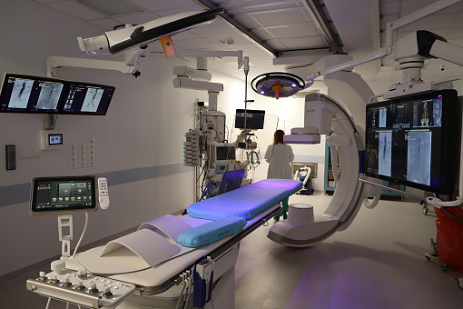Sala operacyjna łączy w sobie funkcje klasycznej sali operacyjnej i pracowni angiografii – dzięki wyposażeniu w urządzenia do obrazowania możliwe jest wykonywanie skomplikowanych zabiegów chirurgii naczyń w sposób zdecydowanie mniej inwazyjny i bezpieczniejszy dla pacjenta.