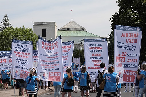 Pielęgniarki i położne – między innymi z OZZPiP – oraz przedstawiciele innych zawodów medycznych protestowali w pobliżu Sejmu. Krzycząc „nie ma medyków, nie ma leczenia”, „czujemy się oszukani, poniżeni, domagamy się godnej płacy” i trąbiąc w wuwuzele, chcieli przekonać posłów głosujących w sprawie ustawy o wynagrodzeniach minimalnych, by zaakceptowali senackie poprawki. Czy udało się ich przekonać?