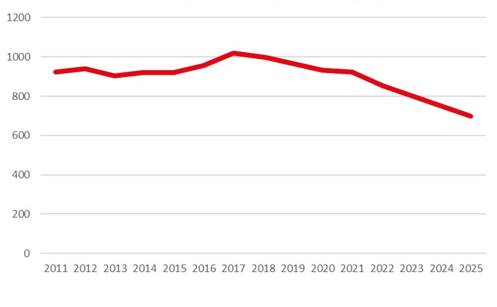 Jeszcze w 2017 r. było to 1019, w 2021 r. – 924, a rok temu 698.